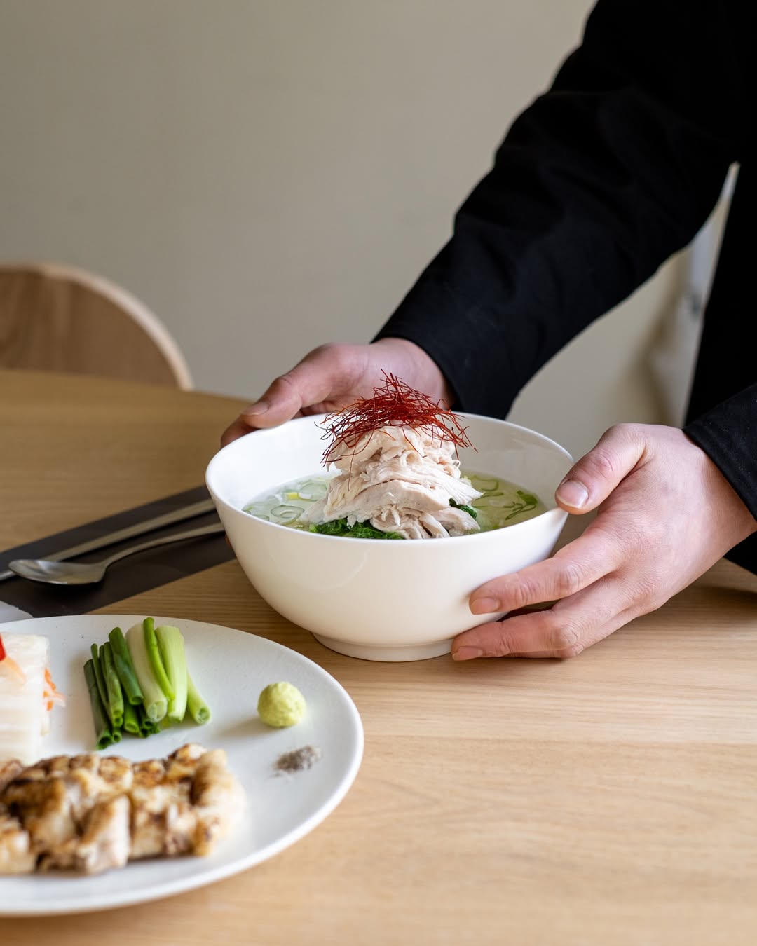 吃之前記得先喝一口原味的湯,再攪拌底部微微的調味醬,慢慢層次才會出來。最上層鋪滿細切辣椒絲,帶出一點微辣感不搶味,中層有蔬菜末增加清爽感,最底層是煨得細緻的雞胸肉,雖然沒經過特別調味,但肉質細嫩、非常純粹。整體喝完有種身體被溫柔安撫的感覺,很適合想吃得清爽或旅行中需要暖胃的一餐。
