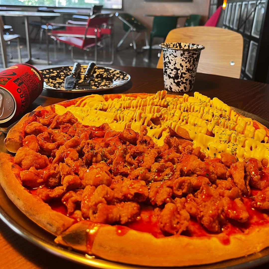 主打可以選擇兩種口味拼成一個半半披薩,像是超人氣的「雞皮披薩」配「大蒜薯條披薩」組合,根本邪惡到不行!雞皮烤得酥酥脆脆,完全沒有腥味,搭配濃郁起司真的一口接一口停不下來~整間店氛圍也超 chill,白天是文青風,晚上還會變得有點微醺感,超適合朋友小聚或約會吃一波!