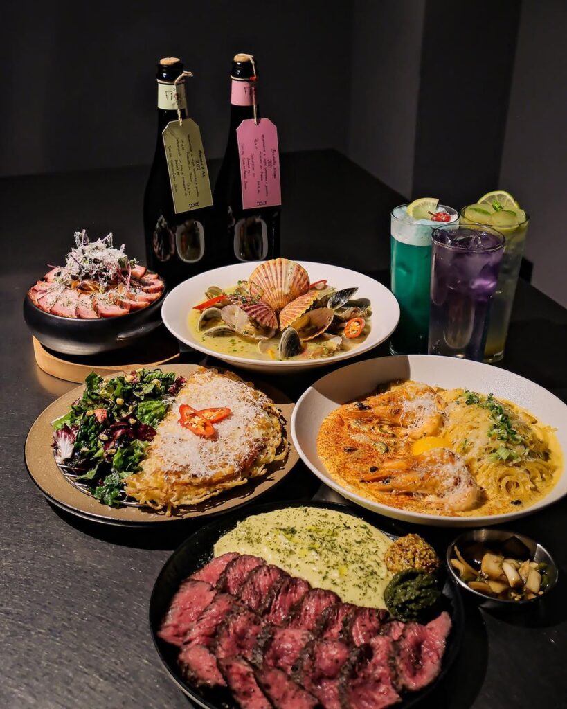 菜單是西式+韓式創意料理,強推青陽辣椒蝦仁義大利麵,微辣清爽完全不膩,蝦子又大又多;酒蒸蛤蜊吃到最後還能請店員幫忙做成意大利麵,CP值爆高!調酒也很用心,「Winter Rain」這款藍色雞尾酒不只好喝還超好拍,還有芒果系列也很有水準。每次來都會被這裡的氛圍收服,儀式感滿分!