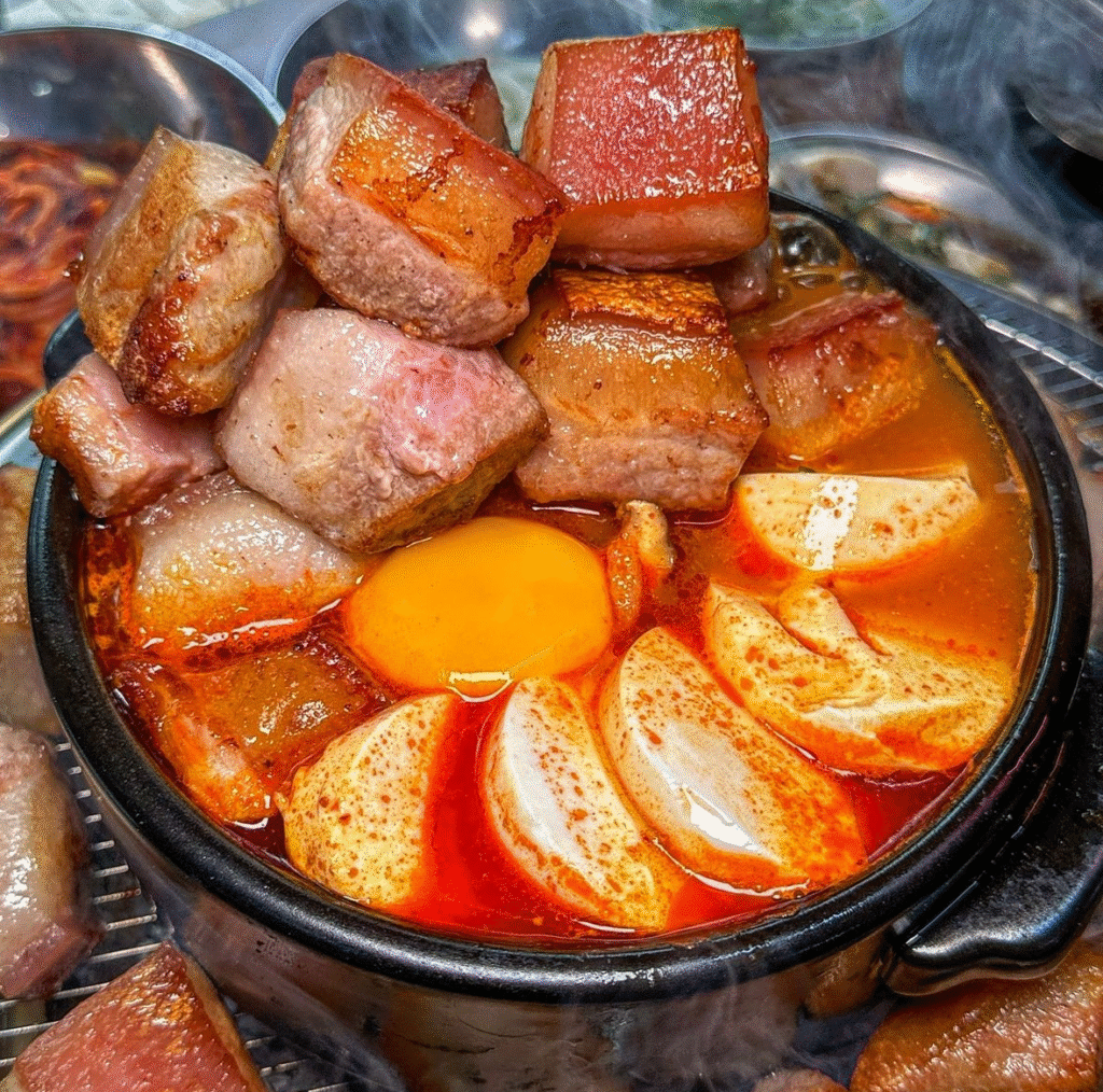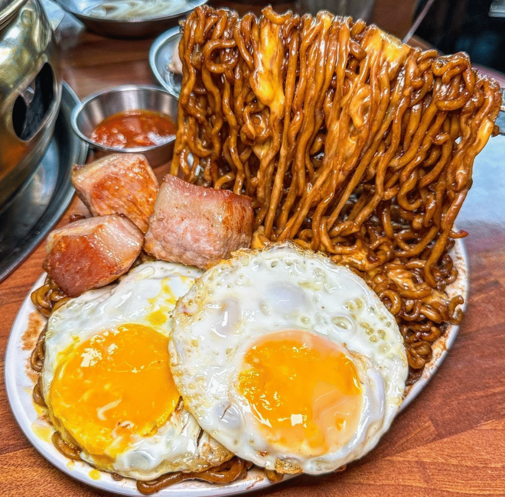 肉塊剪成骰子大小,每一塊都超嫩超香,沾鹽或搭生菜都超讚。第一次吃烤豬皮整個被圈粉,烤到滋滋作響再沾點黃豆粉解膩剛剛好。還有很多人推薦的炸醬泡麵可以選辣或不辣,附上半熟蛋和起司,雖然份量不小但真的會想加點!有中文菜單,點餐沒壓力!