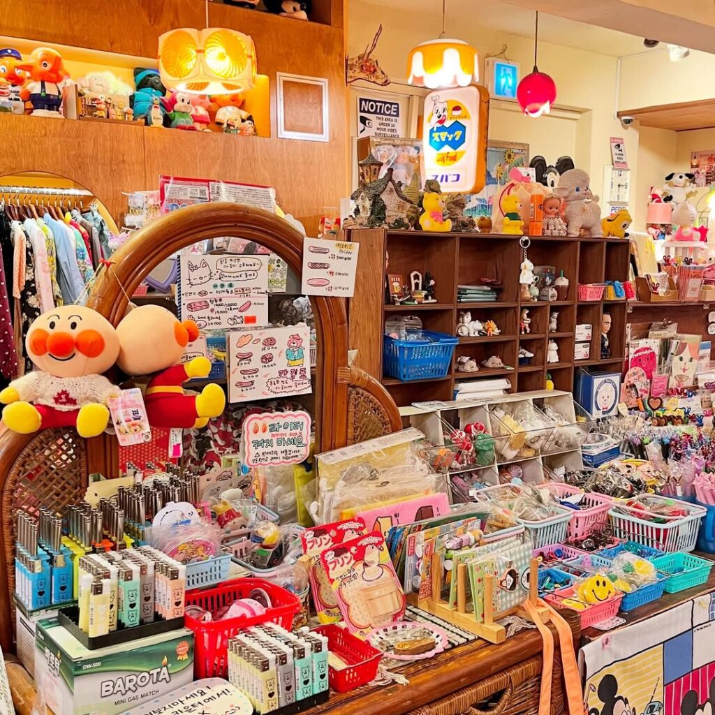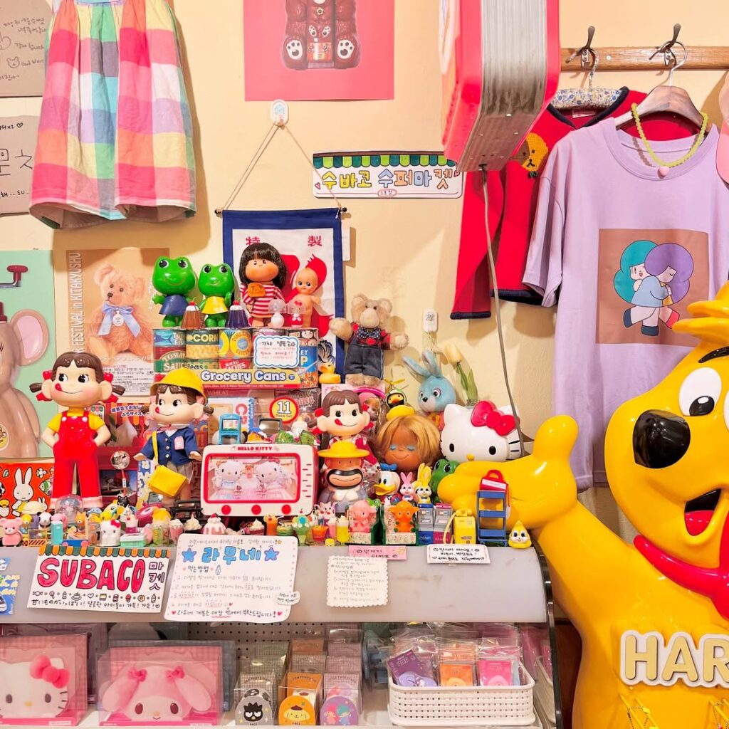 位在弘大七號出口附近的 Subaco,是一間藏身地下的可愛玩具雜貨屋,走進店裡真的像穿越到昭和時代的玩具店,整體氛圍充滿日系復古感,每個角落都讓人想慢慢逛、慢慢挖寶。