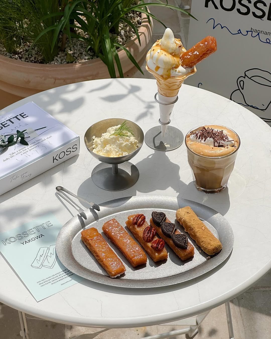 Kossette 位於漢南洞大使館路的一條小巷內,有種挖到咖啡秘境的感覺。店內裝潢融合工業風與溫暖木質元素,柔光灑落空間感很舒適,適合安靜地工作、看書或放空。咖啡選用自家烘焙豆,推薦一試他們家的拿鐵,奶泡綿密、風味濃郁,品質穩定。甜點部分則主打重新詮釋的韓式藥果(Yakgwa),酥鬆的層次搭配不同創意口味(像是 Oreo、黃豆粉、鹽味焦糖),是這裡最具代表性的點心之一。整體氛圍簡單、安靜又有質感,很適合想遠離人潮、找一個角落靜靜喝咖啡的時候。