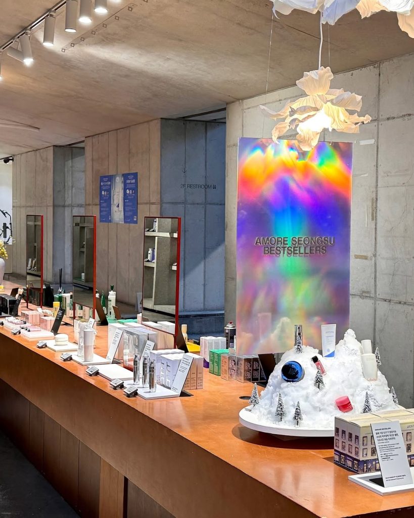 AMORE Seongsu(아모레 성수)是韓國美妝巨頭 Amorepacific 於聖水洞打造的全新美妝體驗空間,將舊汽車修理廠改造成融合現代與自然元素的時尚場所,中央設有宛如都市森林的花園,讓人一踏入便感受到寧靜與綠意。店內匯集了超過 30 個品牌、3,000 多種產品,從知名的蘭芝、雪花秀到新興品牌一應俱全,所有產品都以開放式陳列,讓顧客自由試用,無需壓力地找到最適合自己的美妝品。