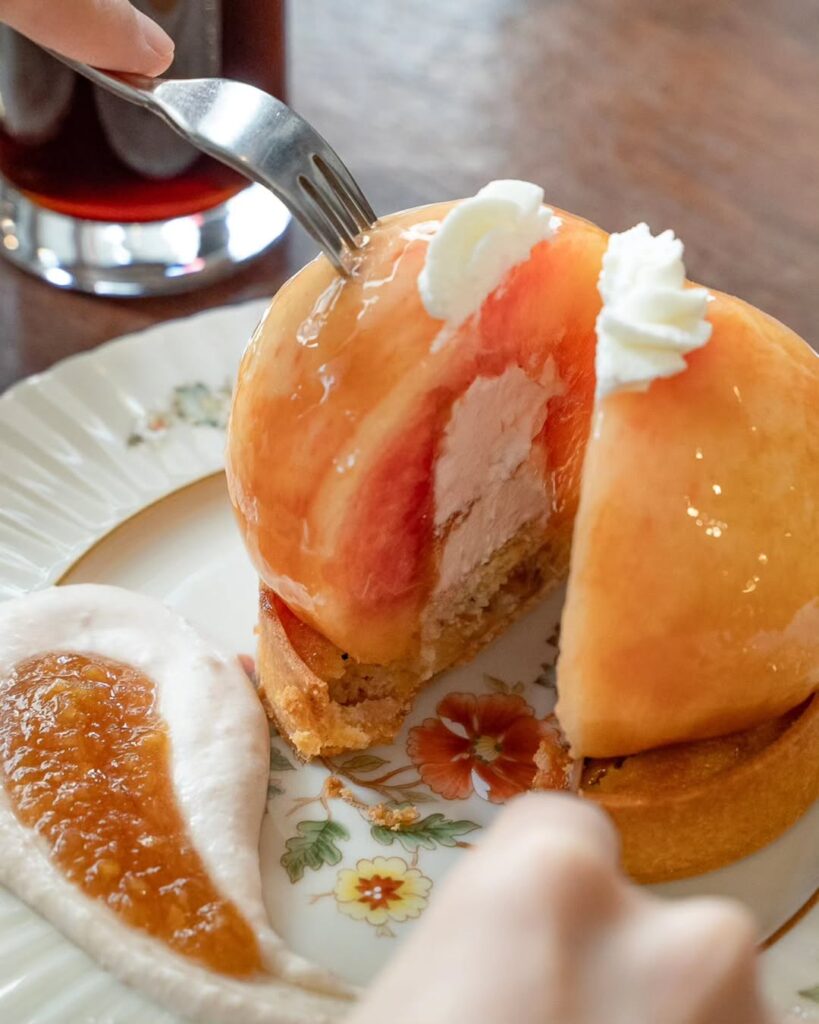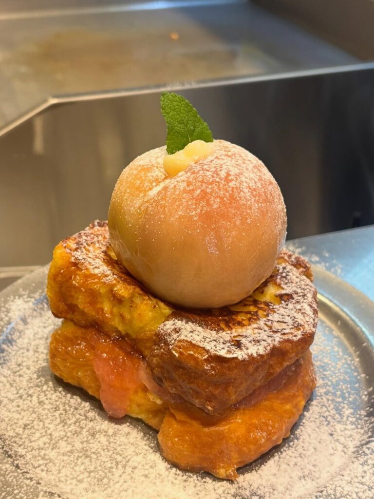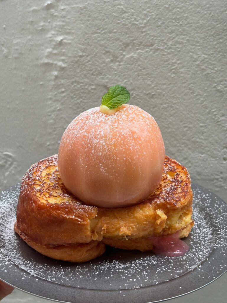 這家真的把法式吐司玩出新高度!端上桌就是一顆完整的水蜜桃,挖空後填滿滑順的奶油,底下是烤到金黃焦脆的吐司。