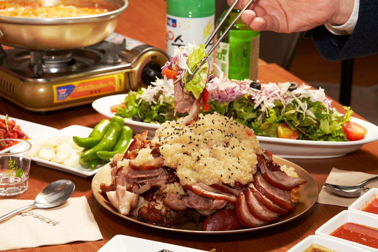他們家最招牌的就是「蒜味豬腳」,豬腳上鋪了滿滿像小山一樣的蒜泥,蒜泥處理得很好,吃起來沒有嗆辣感,反而是滿滿的蒜香和甜味,非常解膩。更棒的是,點主餐就會附送生菜沙拉、泡菜湯和手工拉麵,CP值超高,是許多年輕人和學生的聚餐首選。