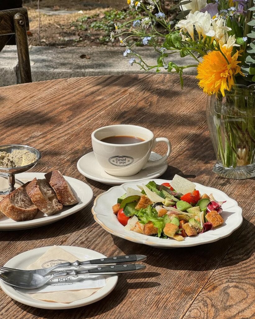 在東大門想找一家可以好好吃頓早午餐、又能坐下來慢慢享受氛圍的店,Corned e pepe 絕對是首選之一。整間店空間很大,室內裝潢超有品味,還有超美的戶外庭院,坐在那邊真的很放鬆也超好拍!